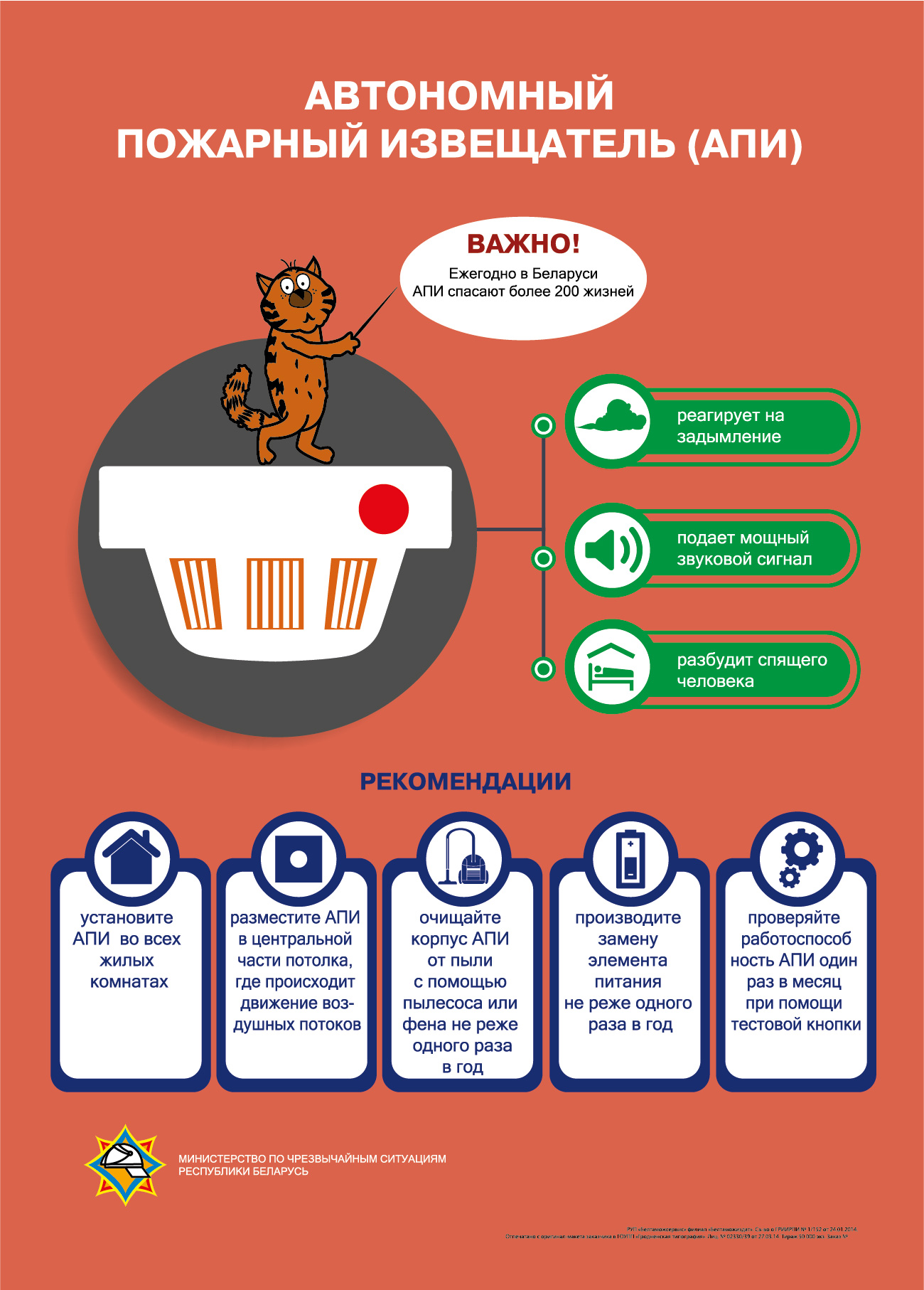 МЧС рекомендует устанавливать АПИ вкаждой жилой комнате, особенно в тех местах, где наиболее вероятно возникновение пожара, например, вблизи электроприборов или печей. Помните, правильно установленный и работающий автономный пожарный извещатель – это ваш шанс спастись и сохранить свое имущество.